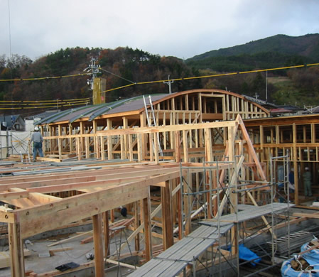 | この現場では珍しく上棟式の時、棟梁が屋根に上がり、5円玉と、お餅を袋に詰めて下の人達に投げ分けるという式典だった。 | ||||