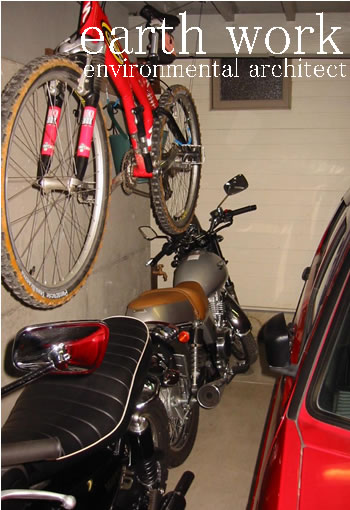 我が家のガレージの写真です。あまりに煩雑でお見せするのは心苦しいのですが、これが私の城です。この城に所狭しと乗り物が納まっています。17年物の古い車、オートバイ2台、そしてMTB1台が収納されています。 |